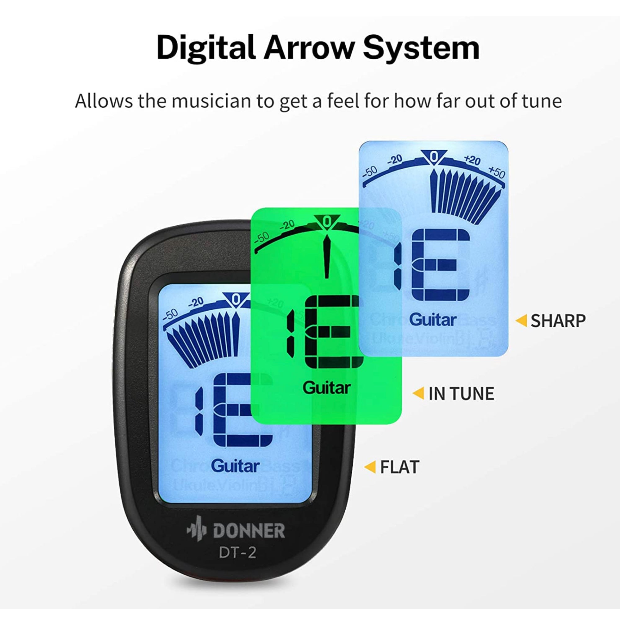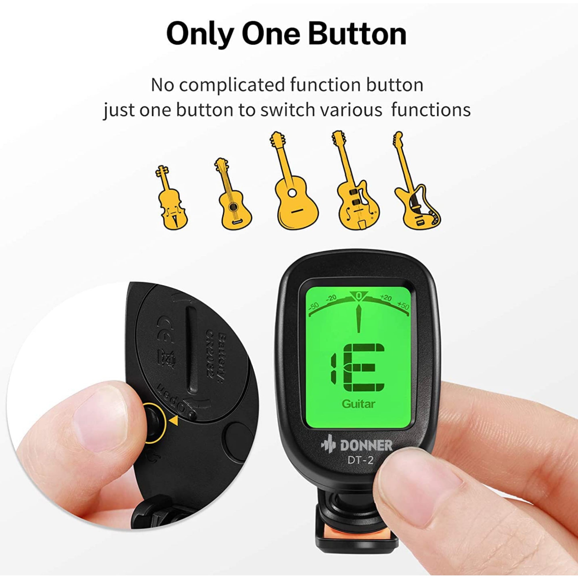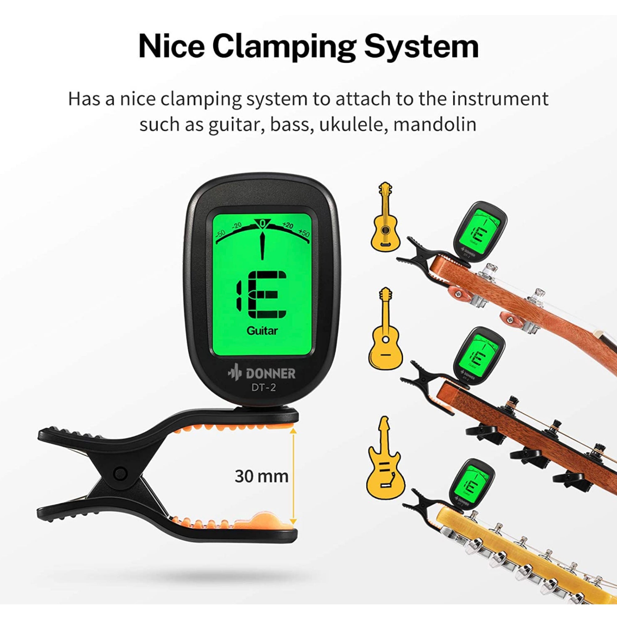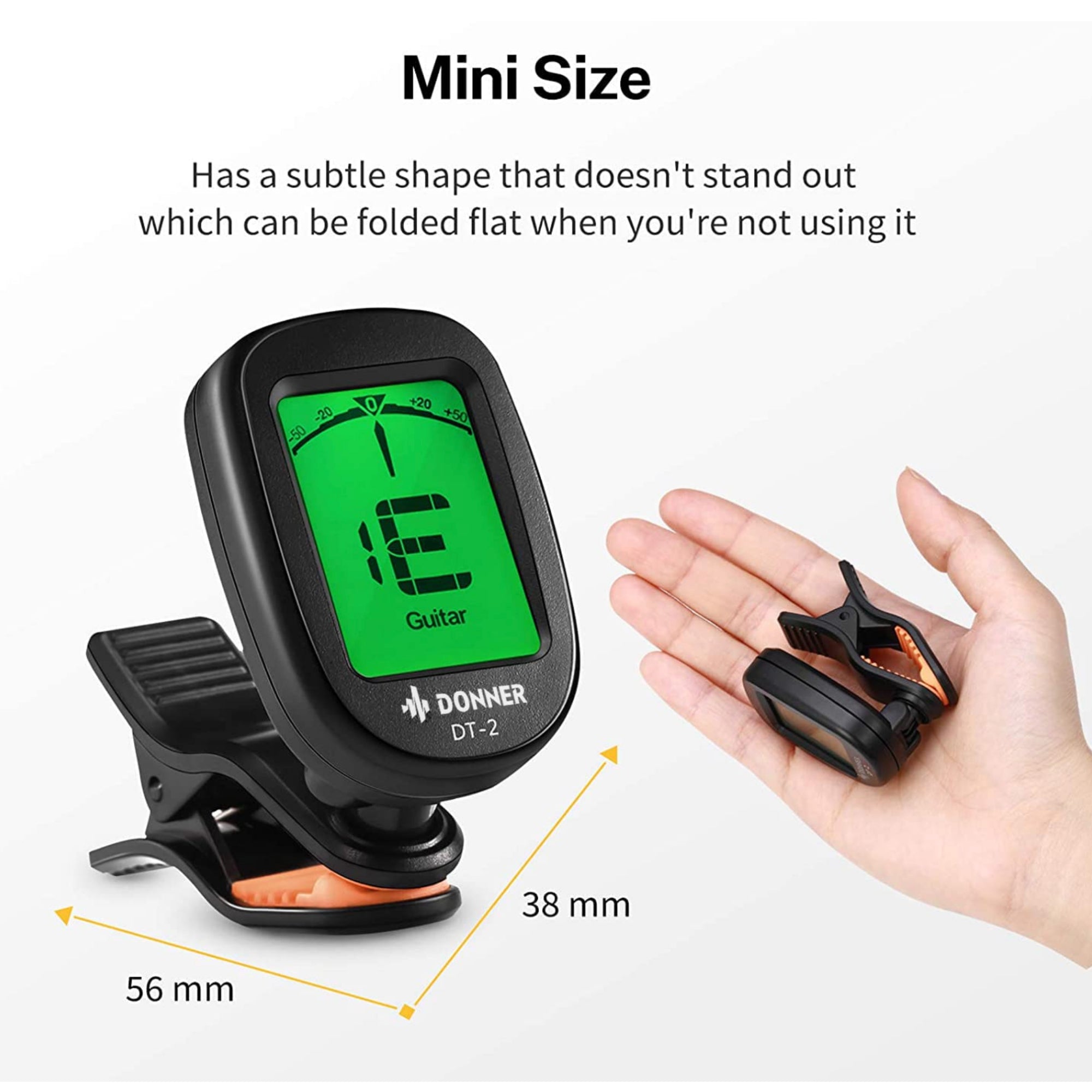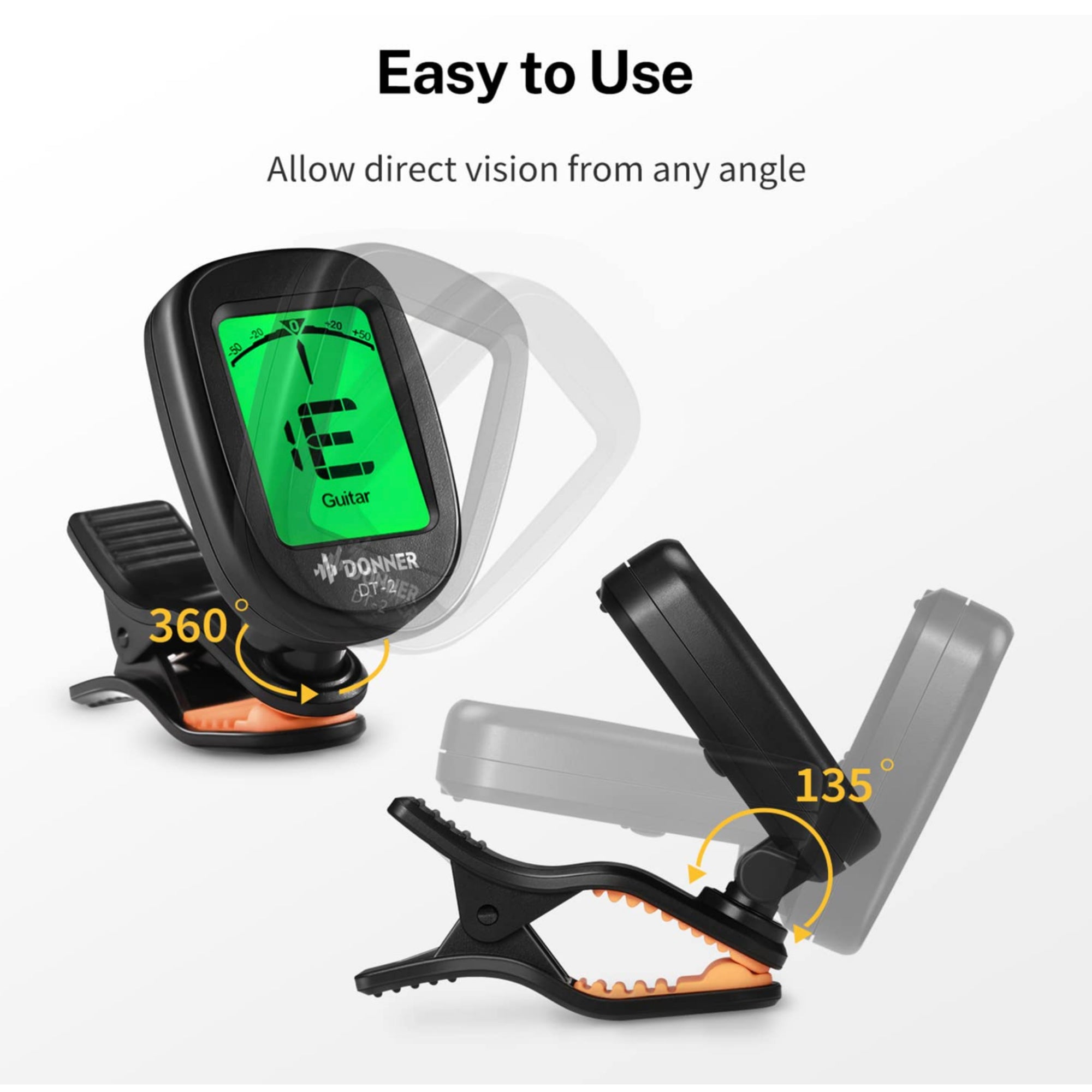 Chromatic clip-on tuner for guitars, bass, ukulele, and violin. Bright LCD display, 360° rotatable.